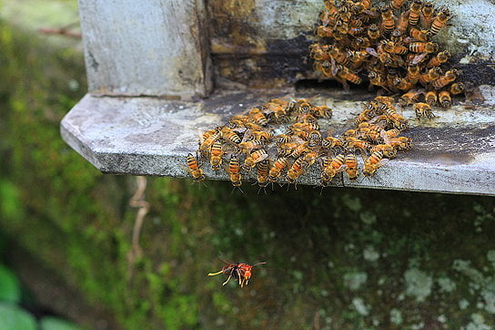 黃腳虎頭蜂停在蜂箱平台,義大利蜂保持距離守衛巢口。
