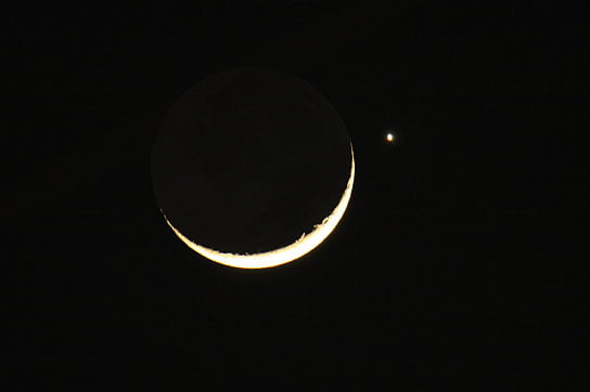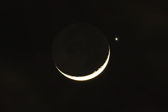 19:32天文暮光之後(即:天色完全暗下之後),金星和月亮的距離愈來愈近,最接近的時候約在19:52左右,金星幾乎是貼著月亮邊緣,像是個帶著酒窩的微笑一樣,非常特別,