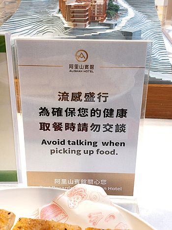 我總希望自助式餐廳可以有幾個牌示,提醒顧客取食時不語。阿里山賓館餐廳在餐食檯就立有一個提醒告示,要顧客「取餐時請勿交談」。雖然注意到的人可能不多,但畢竟管理者有想到要這樣標示,也是一種大眾衛生教育與公民道德教育,這點值得肯定。