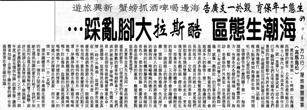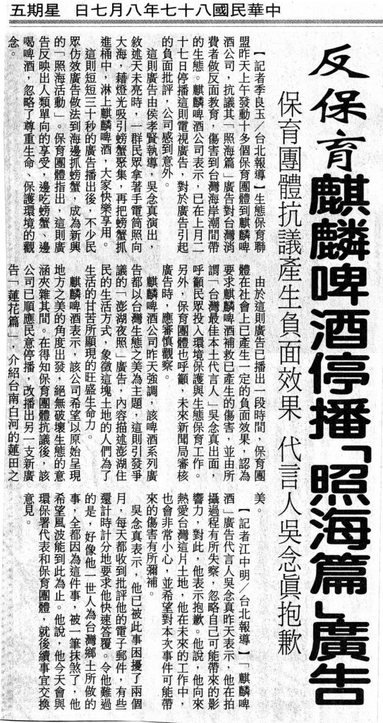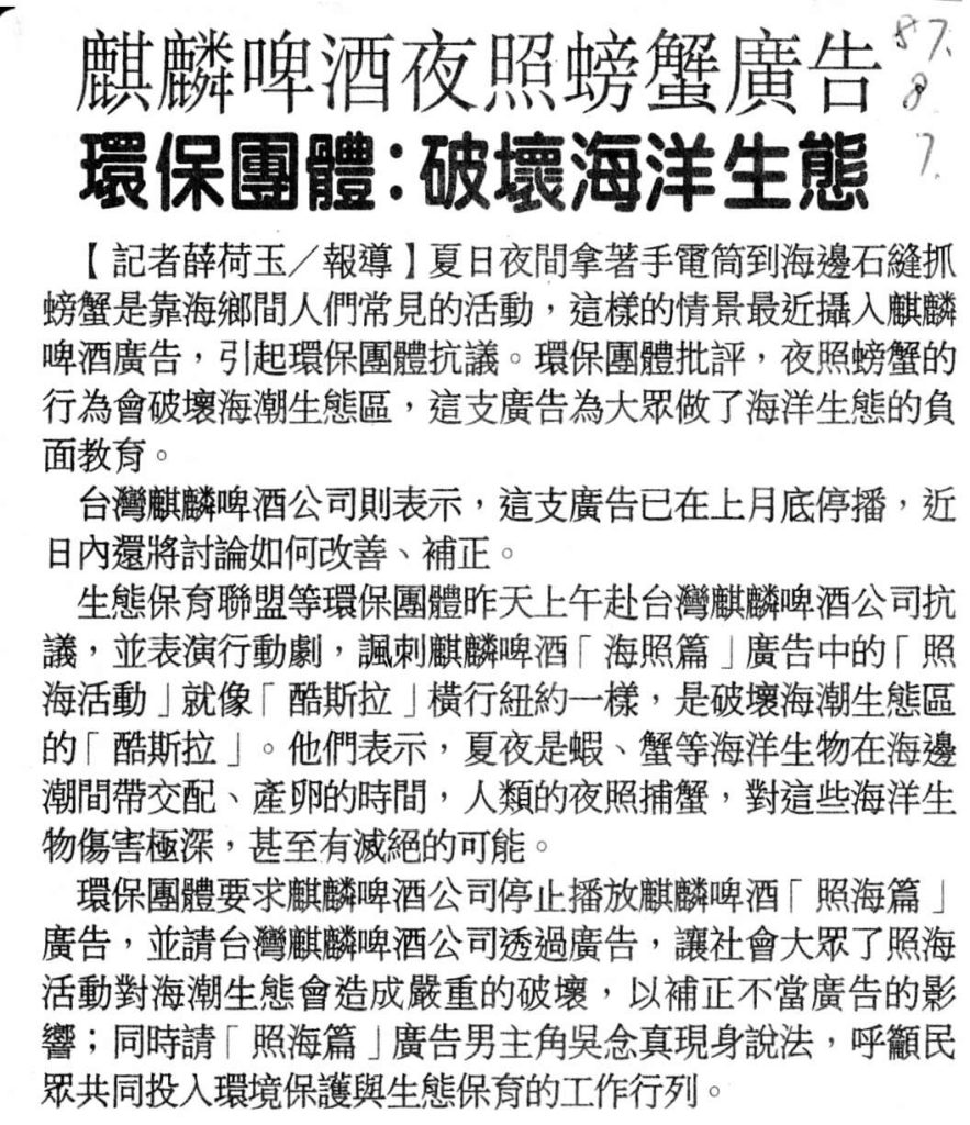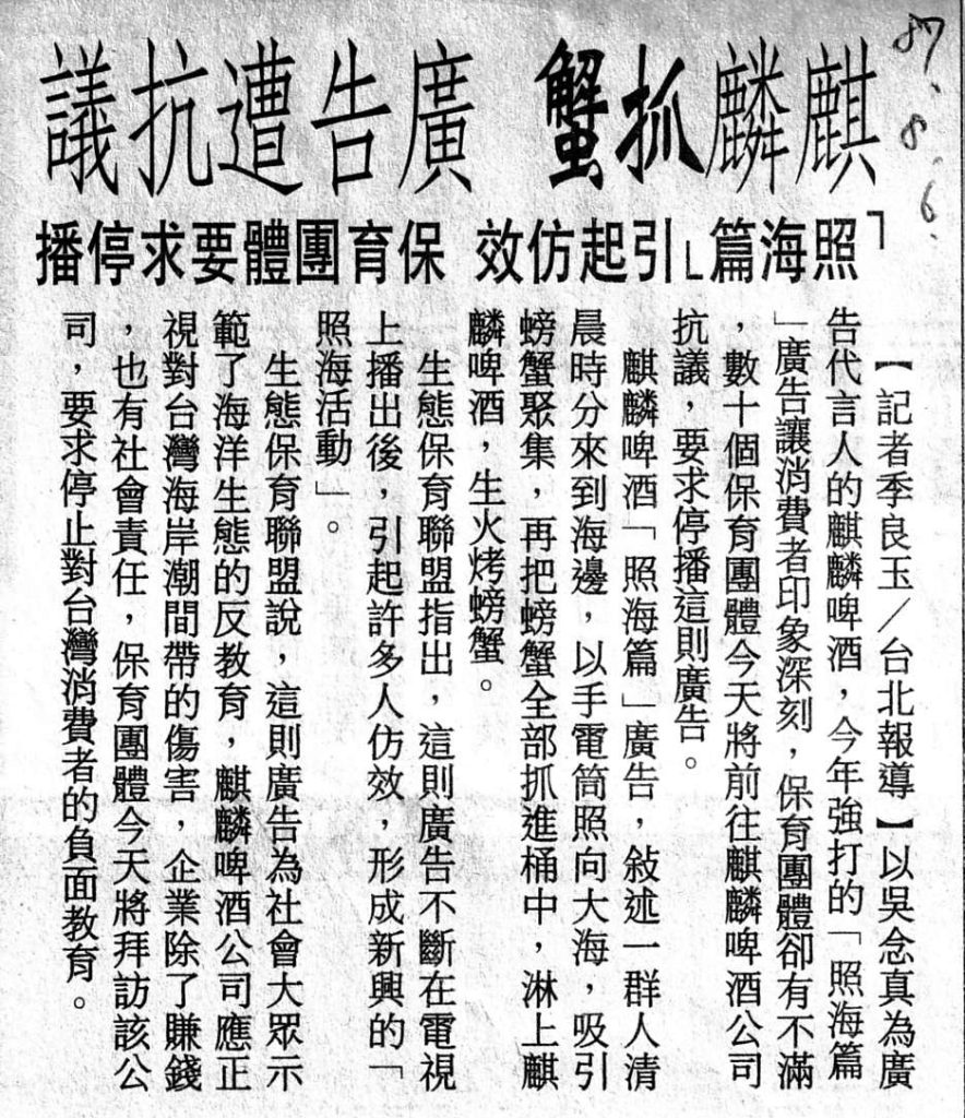 1998年8月6日,台灣「生態保育聯盟」等10多個保育團體,赴台灣麒麟啤酒公司抗議播出廣告片《照海》,指責麒麟是破壞海潮生態的「格斯拉」。生態保育聯盟指出,1998年是國際海洋年,世界各國都在舉辦各類國際海洋年活動,讓人們了解人與海的依存關係,喚起人們對海洋及海洋生態的認識,但是《照海》卻在此時反其道而行之。30秒的廣告片《照海》中,著名台灣導演吳念真晚上手持手電筒,到海邊抓螃蟹,和著啤酒現烤現吃。生態保育聯盟要求麒麟公司立即停播此廣告。