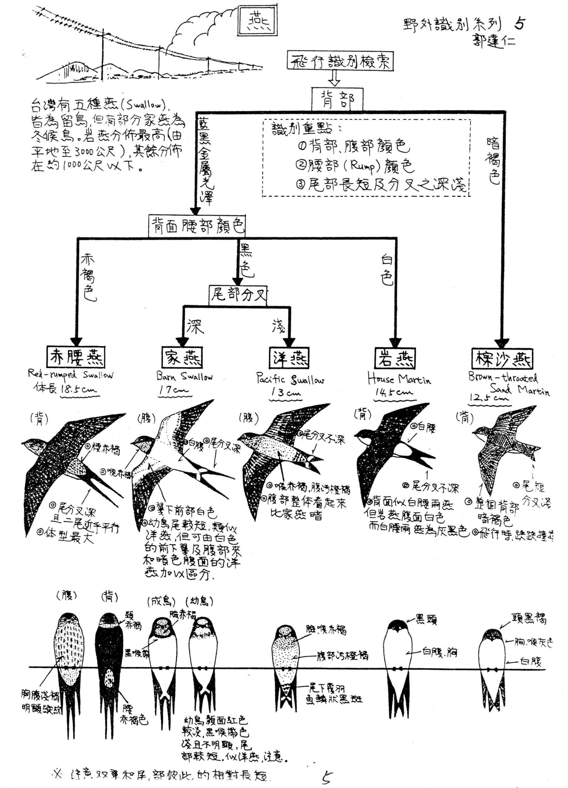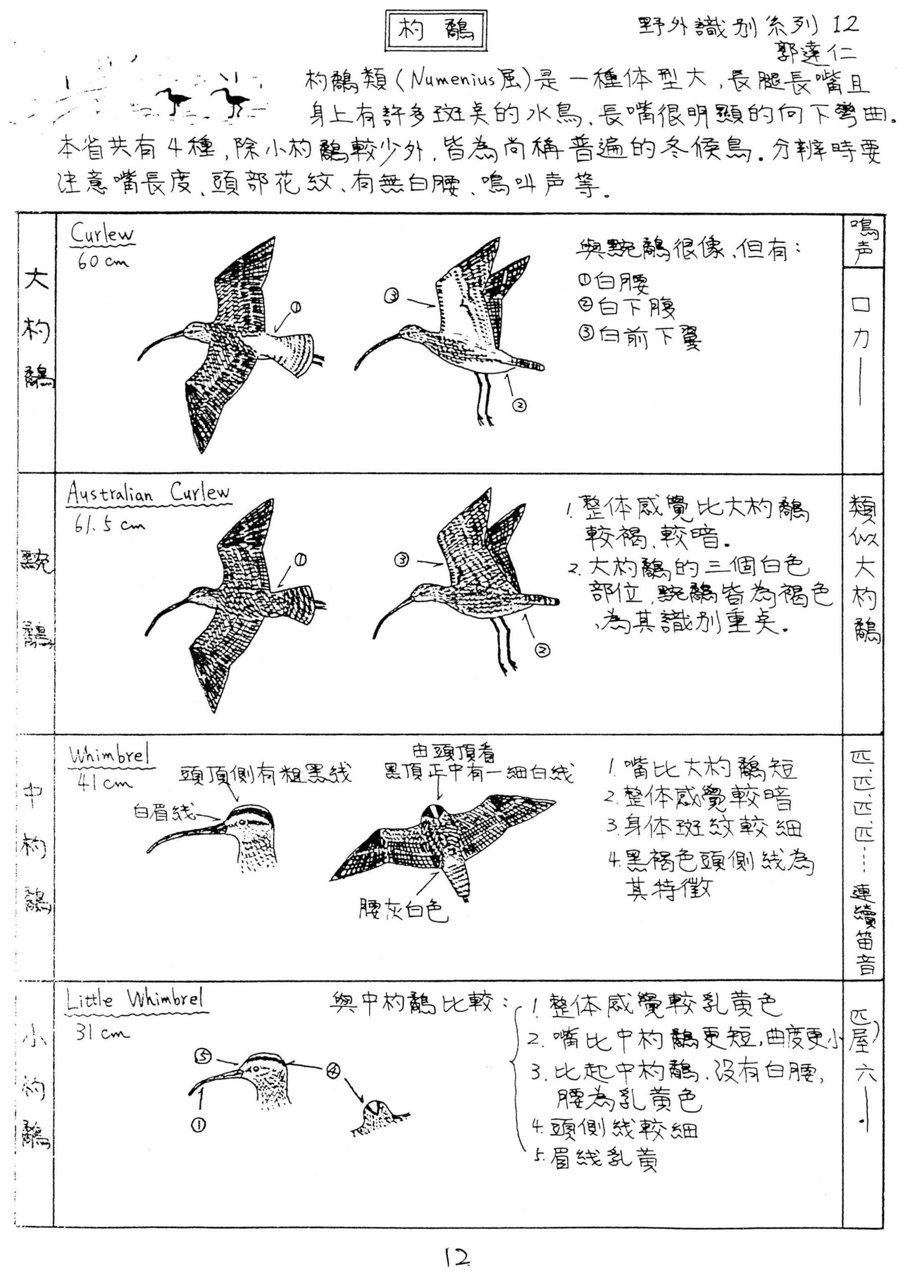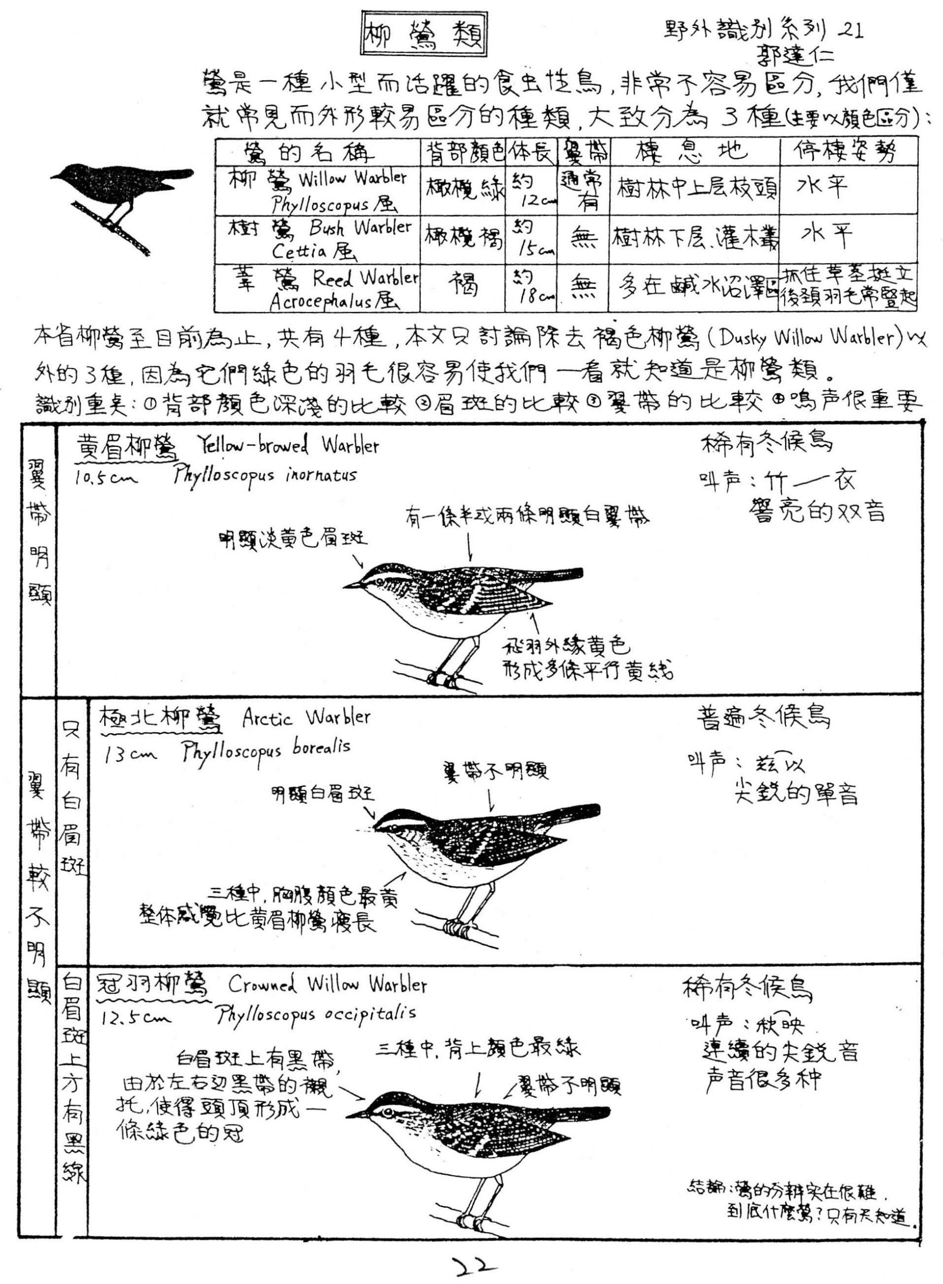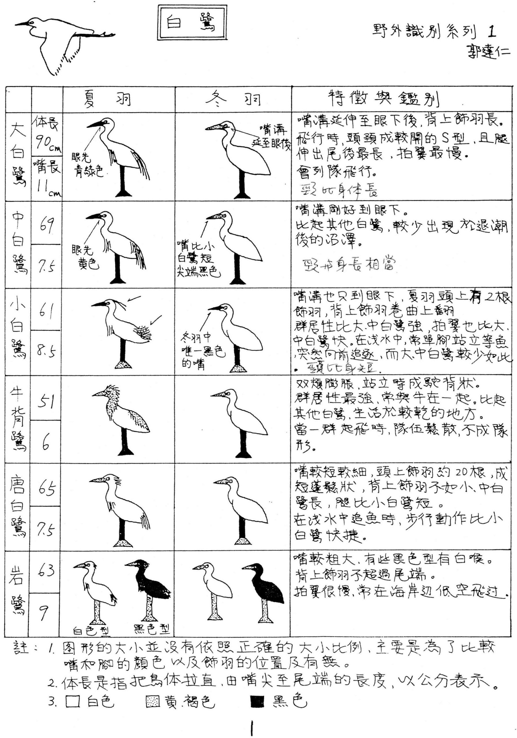 2026(歲次丙午)年春節假期整理舊文件時,發現郭老師早年手繪的《台灣野鳥野外識別手冊》,分有白鷺、雨燕、灰鶺鴒與黃鶺鴒、鷚、燕、水鴨、鶲、秧雞、田鷸、環頸鴴、澤鵟、杓鷸、山雀、鷗、大型鶇、燕鷗、軍艦鳥、青足鷸、鸕鶿、柳鶯、鷿鷈、八哥等22類身形近似的鳥種區別方法。這是推廣賞鳥及自然保育基礎能力為主的小冊,當年郭老師做這事也純是義工奉獻,於是我掃描該圖集內容放在此,讓郭老師對台灣鳥類的愛再次延伸。