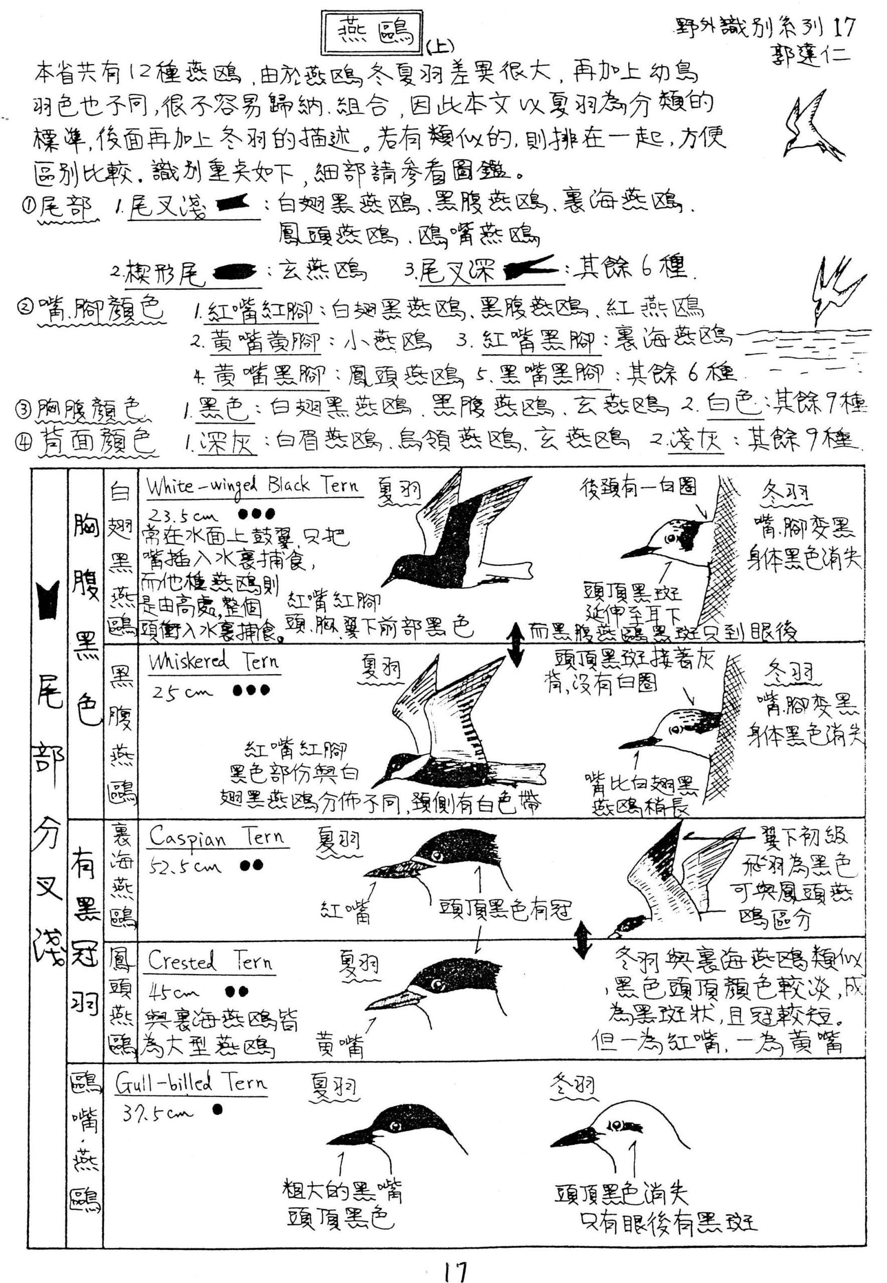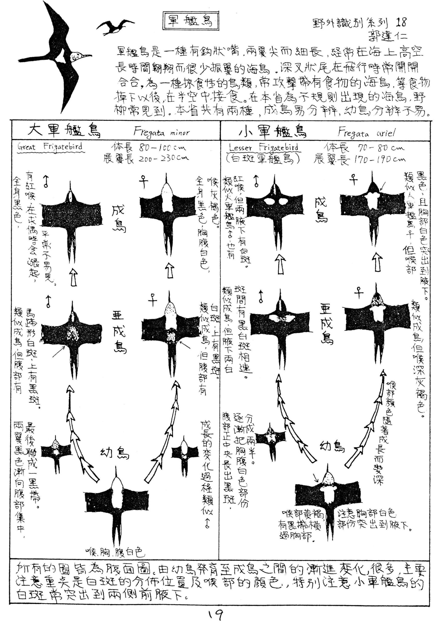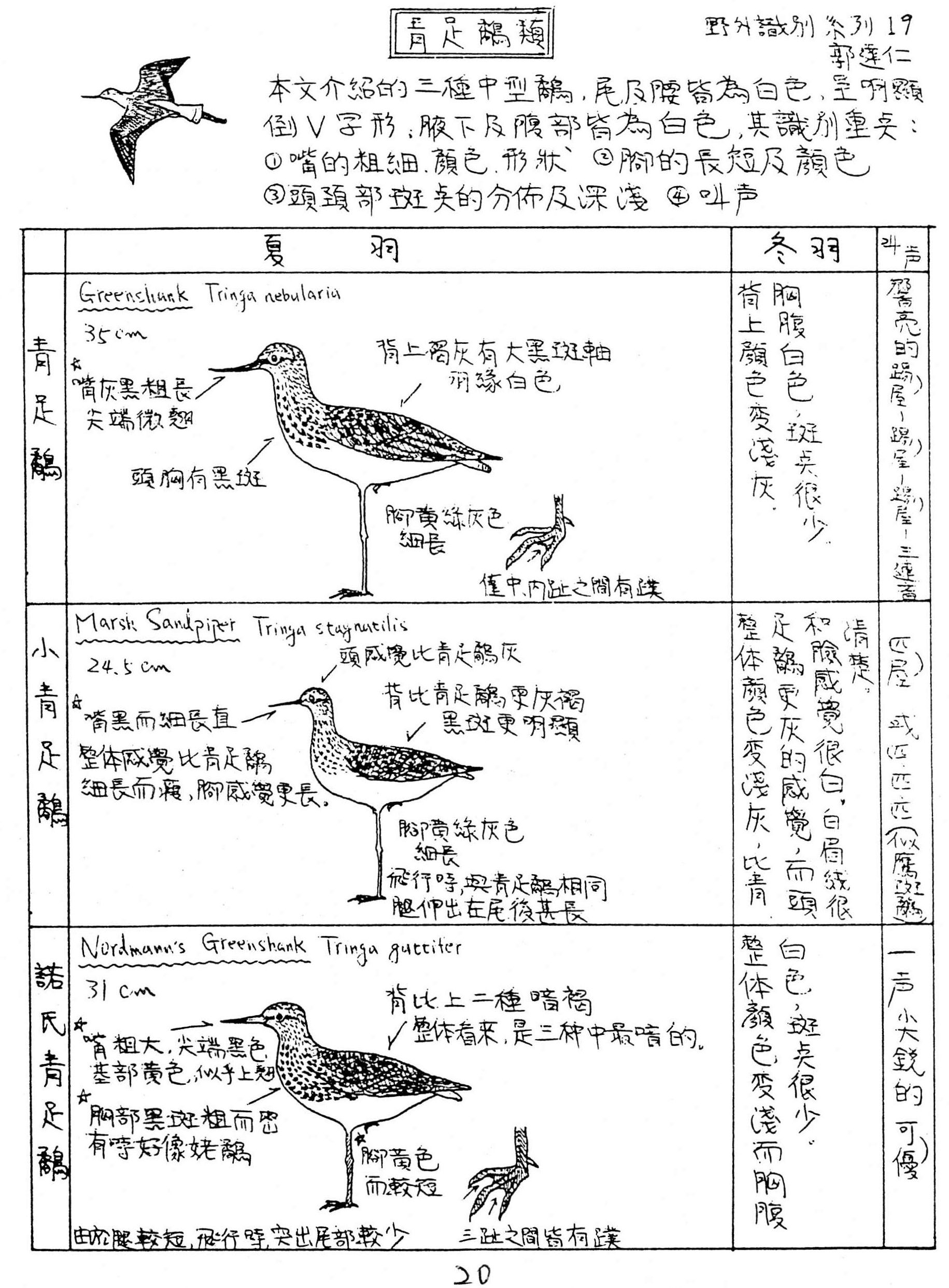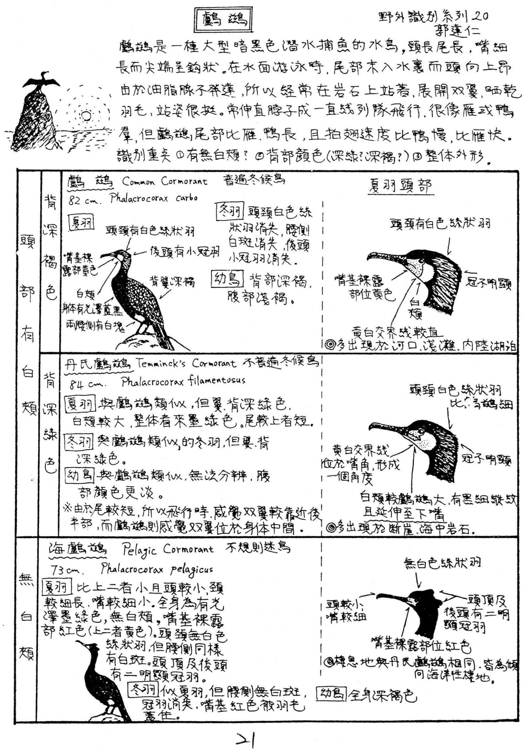 2026(歲次丙午)年春節假期整理舊文件時,發現郭老師早年手繪的《台灣野鳥野外識別手冊》,分有白鷺、雨燕、灰鶺鴒與黃鶺鴒、鷚、燕、水鴨、鶲、秧雞、田鷸、環頸鴴、澤鵟、杓鷸、山雀、鷗、大型鶇、燕鷗、軍艦鳥、青足鷸、鸕鶿、柳鶯、鷿鷈、八哥等22類身形近似的鳥種區別方法。這是推廣賞鳥及自然保育基礎能力為主的小冊,當年郭老師做這事也純是義工奉獻,於是我掃描該圖集內容放在此,讓郭老師對台灣鳥類的愛再次延伸。