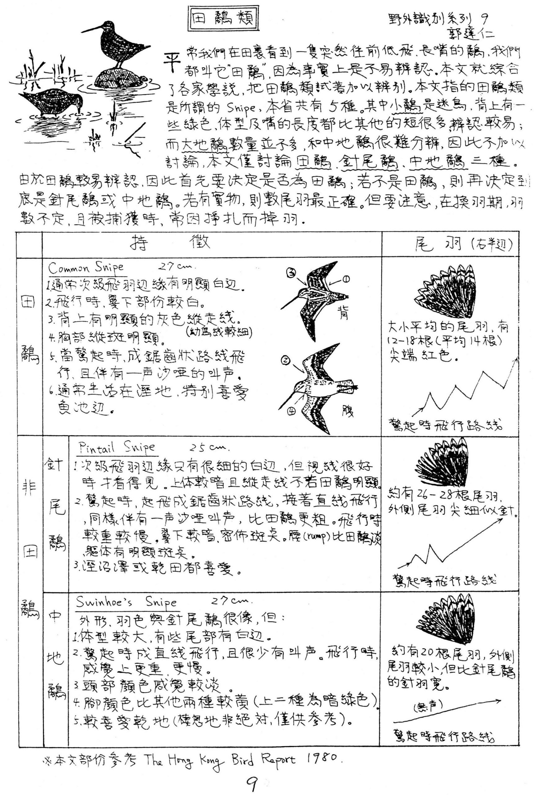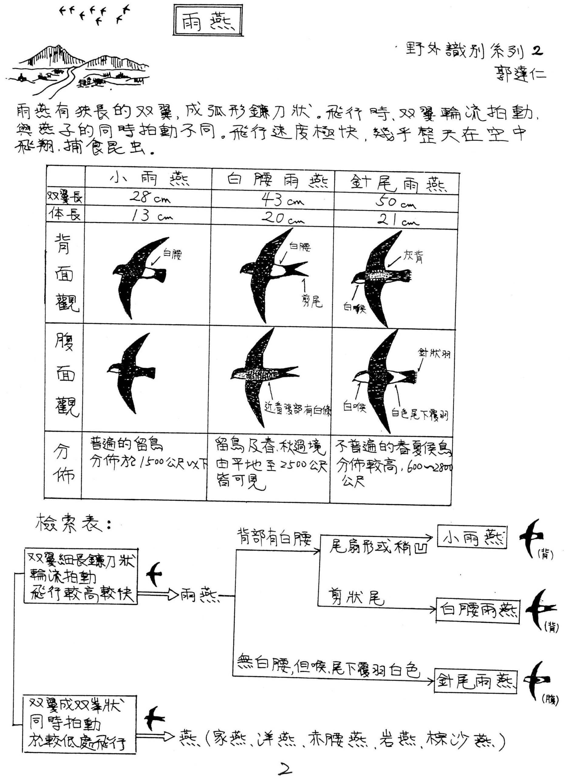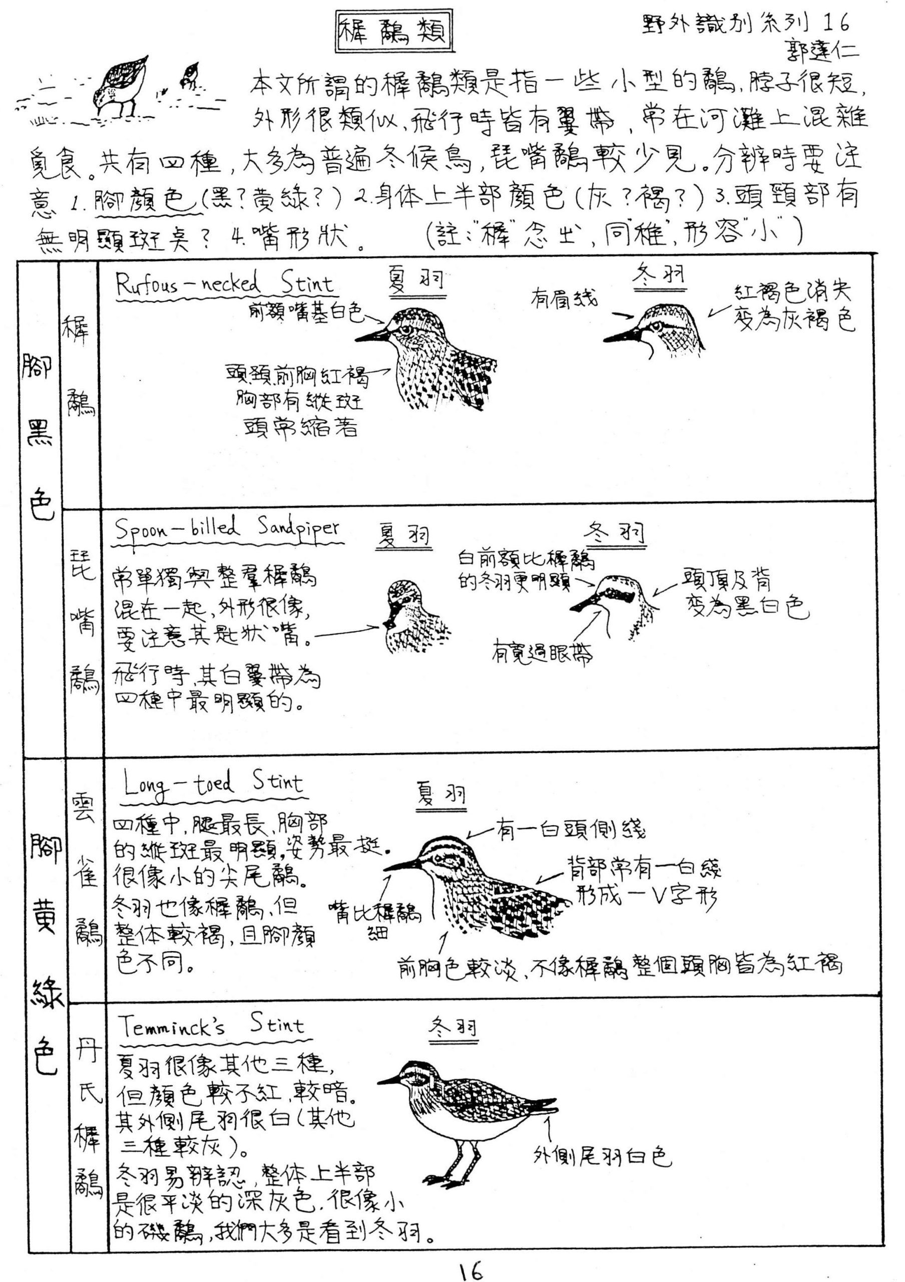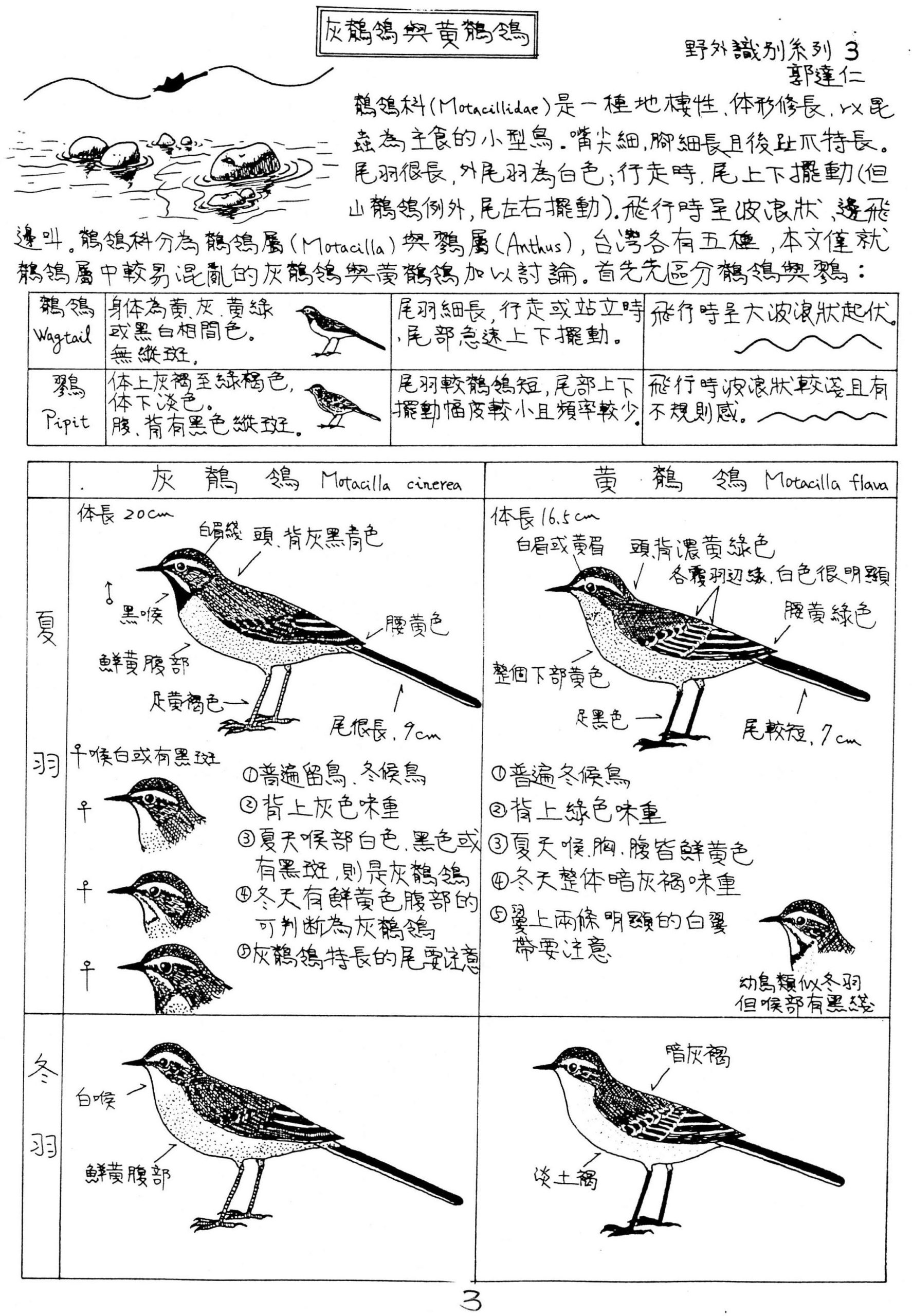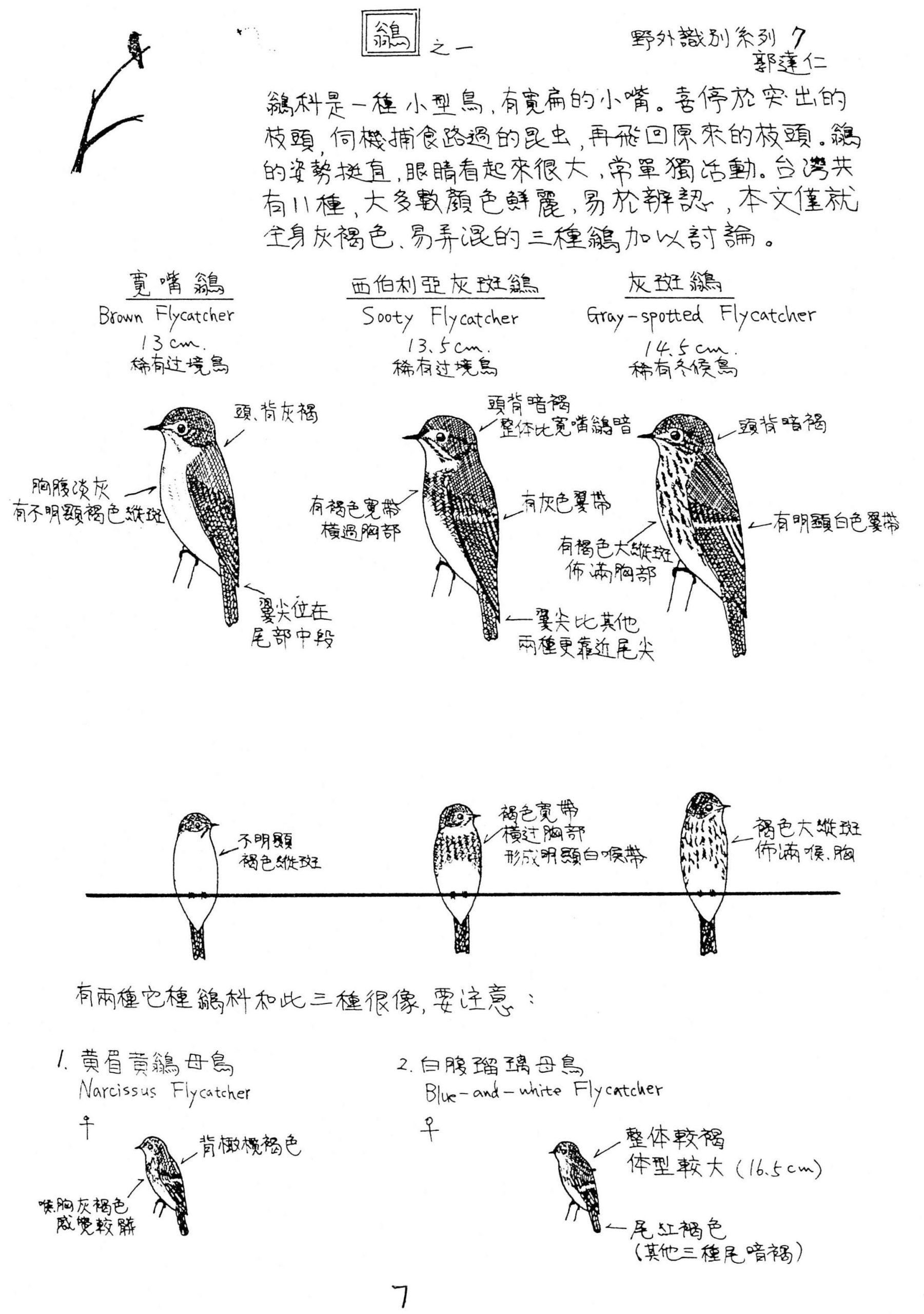 2026(歲次丙午)年春節假期整理舊文件時,發現郭老師早年手繪的《台灣野鳥野外識別手冊》,分有白鷺、雨燕、灰鶺鴒與黃鶺鴒、鷚、燕、水鴨、鶲、秧雞、田鷸、環頸鴴、澤鵟、杓鷸、山雀、鷗、大型鶇、燕鷗、軍艦鳥、青足鷸、鸕鶿、柳鶯、鷿鷈、八哥等22類身形近似的鳥種區別方法。這是推廣賞鳥及自然保育基礎能力為主的小冊,當年郭老師做這事也純是義工奉獻,於是我掃描該圖集內容放在此,讓郭老師對台灣鳥類的愛再次延伸。