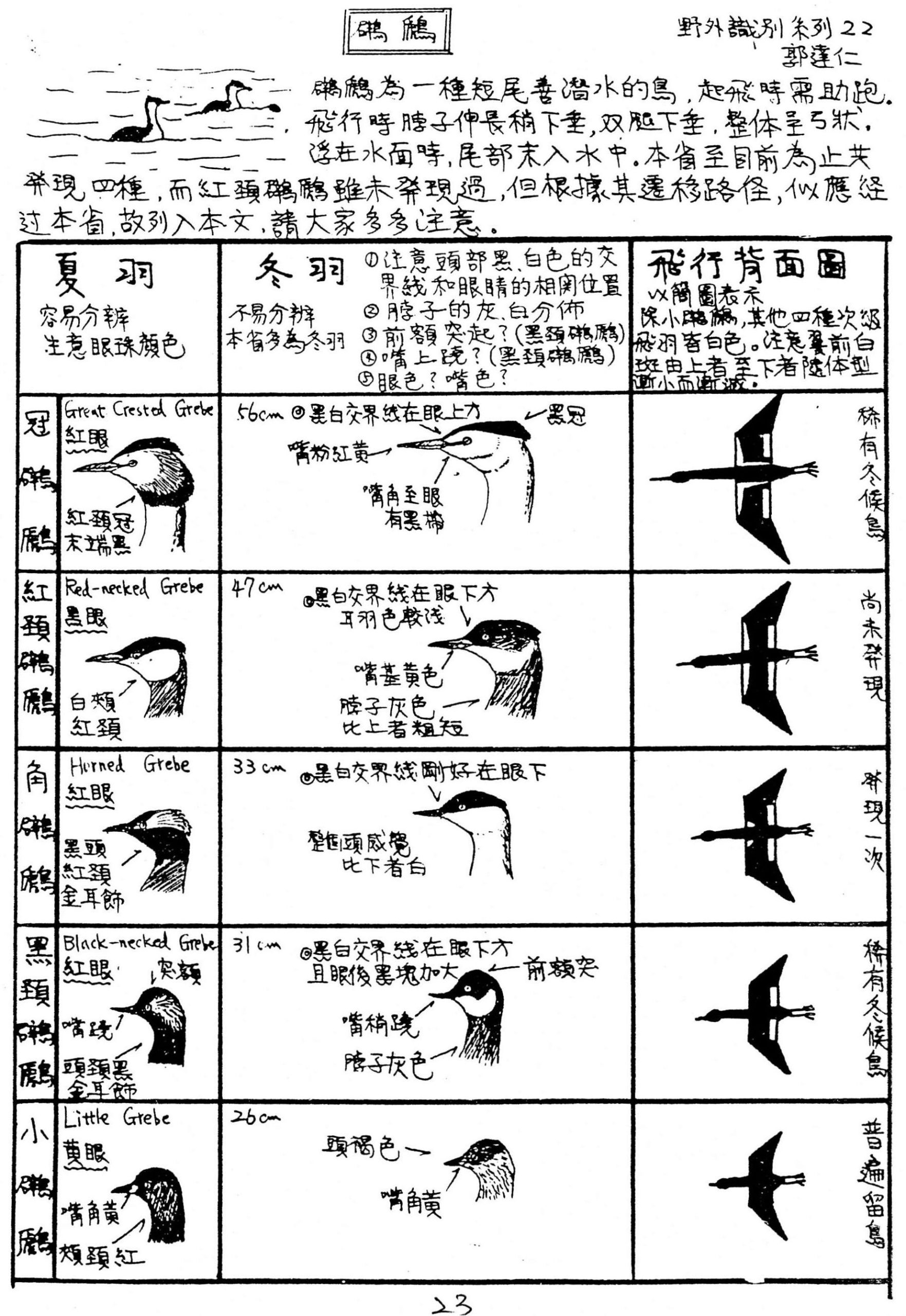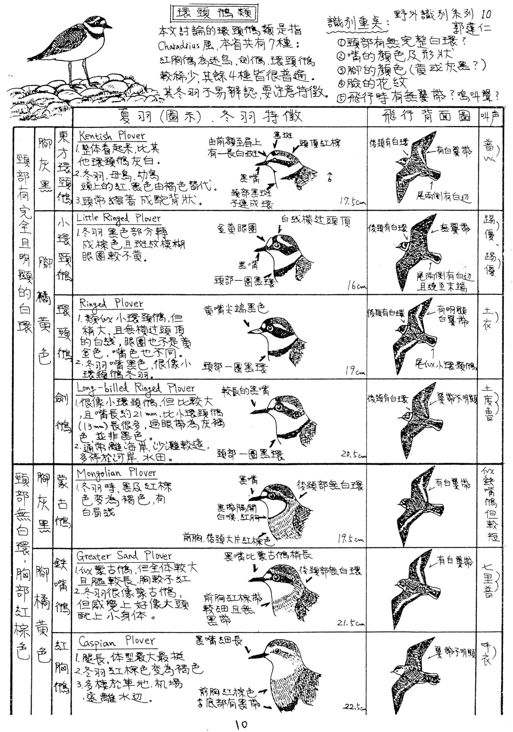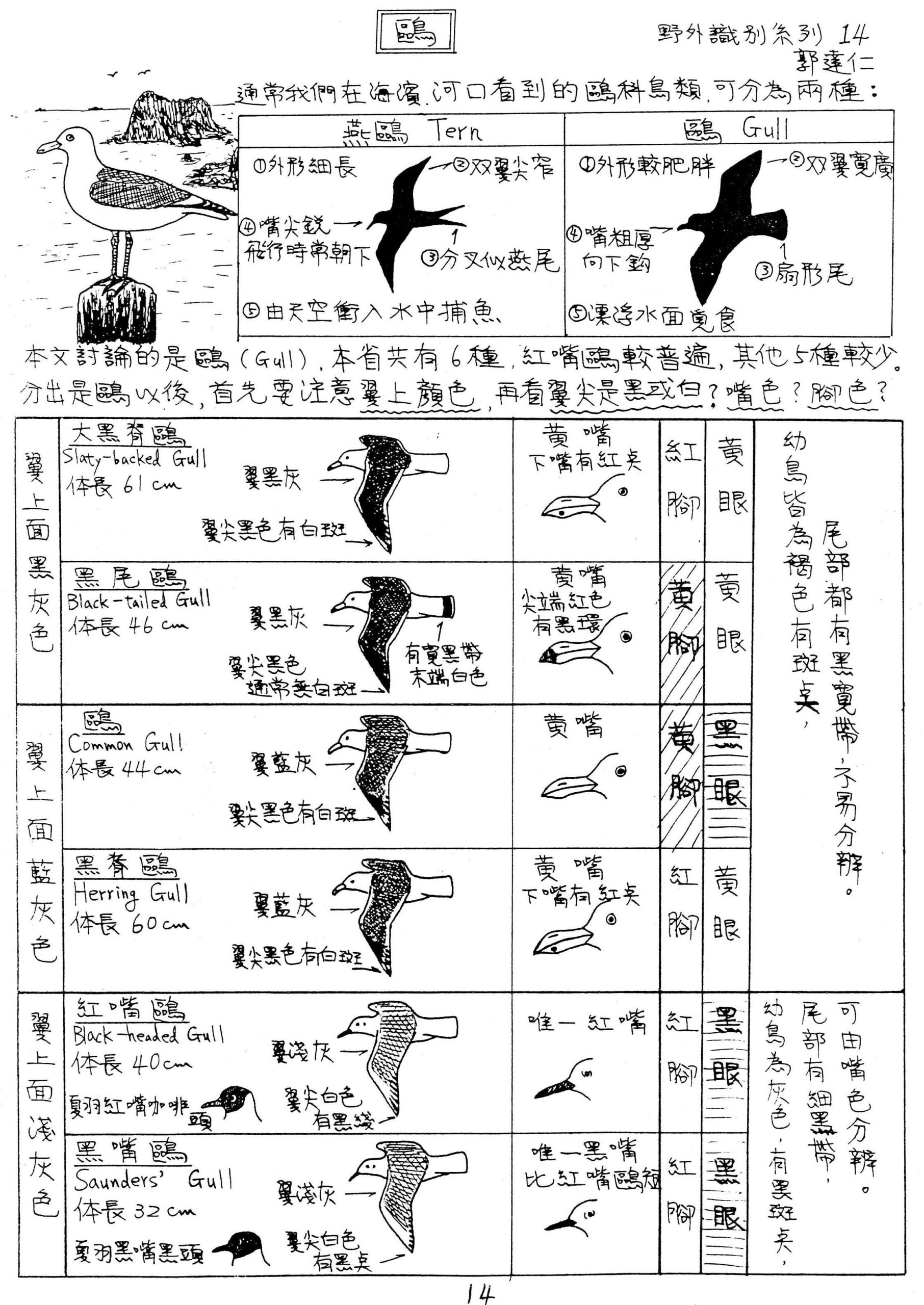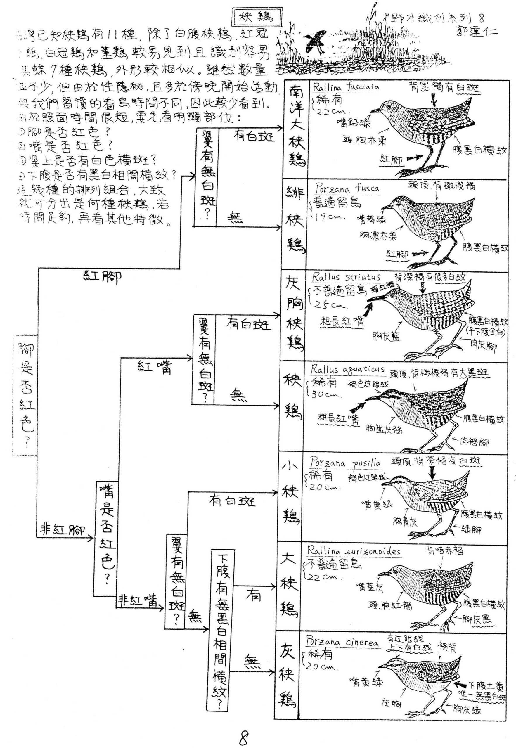 2026(歲次丙午)年春節假期整理舊文件時,發現郭老師早年手繪的《台灣野鳥野外識別手冊》,分有白鷺、雨燕、灰鶺鴒與黃鶺鴒、鷚、燕、水鴨、鶲、秧雞、田鷸、環頸鴴、澤鵟、杓鷸、山雀、鷗、大型鶇、燕鷗、軍艦鳥、青足鷸、鸕鶿、柳鶯、鷿鷈、八哥等22類身形近似的鳥種區別方法。這是推廣賞鳥及自然保育基礎能力為主的小冊,當年郭老師做這事也純是義工奉獻,於是我掃描該圖集內容放在此,讓郭老師對台灣鳥類的愛再次延伸。