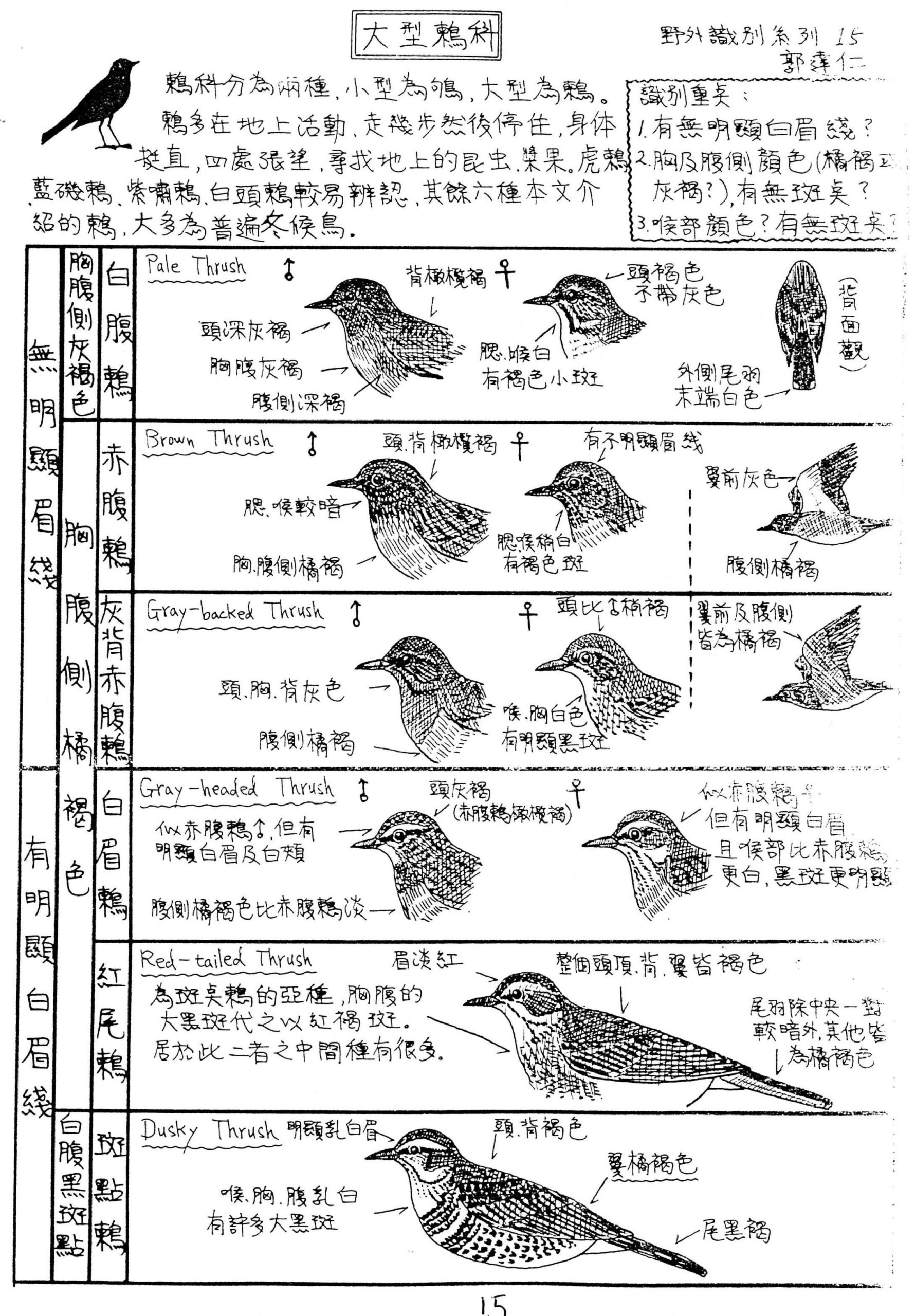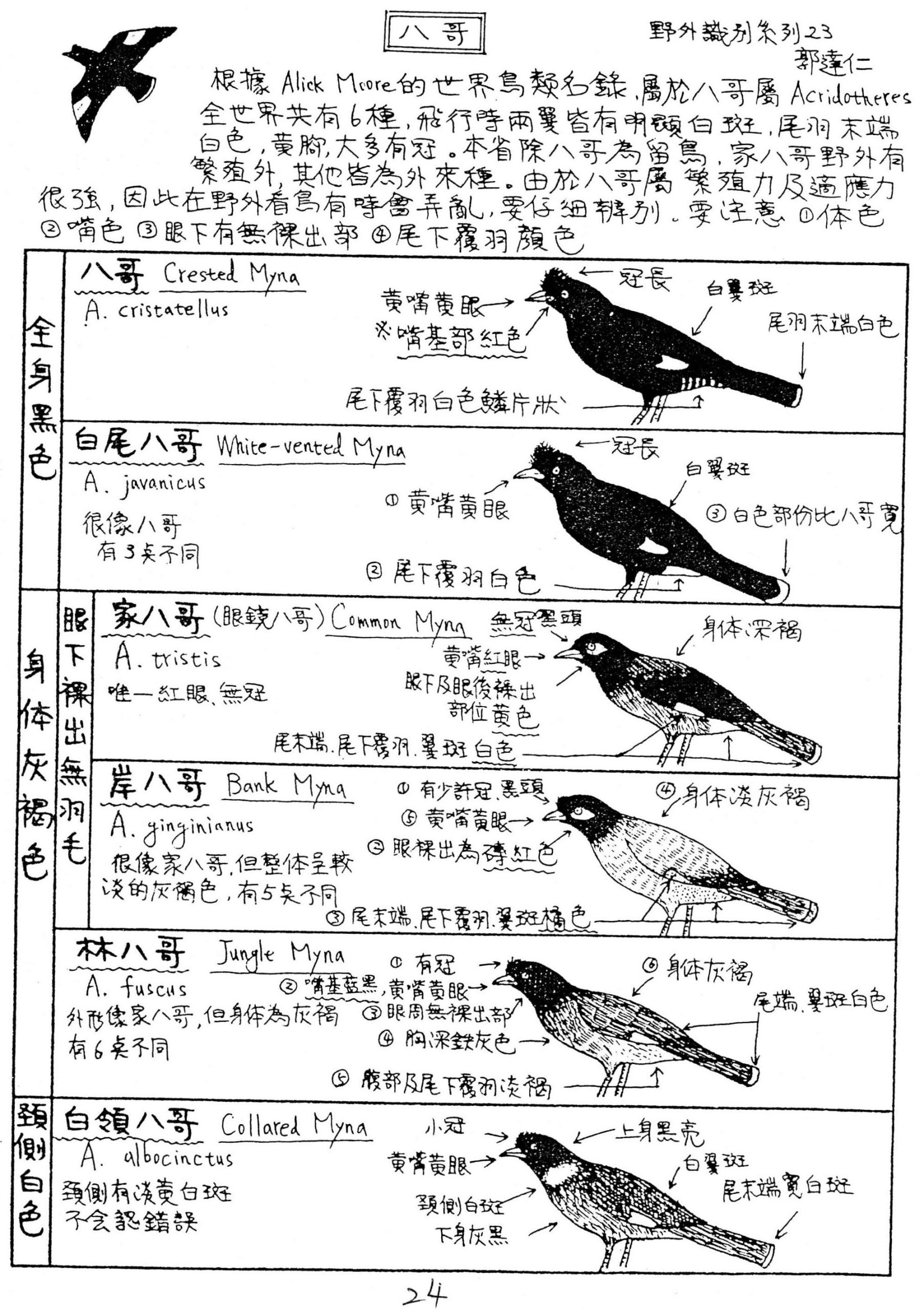 令人尊敬、懷念的鳥會前輩郭達仁老師(台北市野鳥學會及中華民國野鳥學會創會理事長),生前為了讓入門鳥友能儘快辨識一些容易混淆的常見鳥類,於是動手畫了一些以特徵比認鳥種的說明圖(如八哥、水鴨、柳鶯、鷚、杜鵑、燕、鷸、鴴類等),在野外方便比對分辨。郭老師曾在台北鳥會授課講解,我是受益者之一。