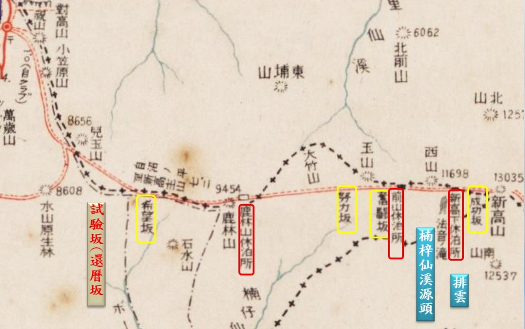 1924年台中州闢建從水裡坑登玉山的新高登山道路,成為新興熱門路線,不甘落於人後的台南州(嘉義當時劃分在台南州行政區內),也在1926年開闢一條阿里山登新高山道路,後來因運材鐵路水山線相繼通車到兒玉(自忠)、新高口,於是在1933年又開了一條從新高口到鹿林山的「自動車道」新道,不知這條「自動車道」是否真的要行駛汽車,或只是意味路況比登山便道更為豪華?在圖中可見到兒玉到新高口有兩條路,石山之後也有兩條新舊道路。(下圖右側)