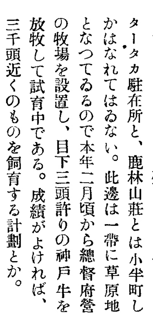 由新高阿里山第八號文內(上圖),描述此草原位置離鹿林山莊不到半町(1町約109公尺)的距離,在塔塔加駐在所附近。依據台南州農會的資料,1936年3月以2126日圓預算,從みかたぐん(兵庫縣美方郡)買來一頭2歲公牛、二頭分別為1歲及1歲10個月的母牛,搭建牛舍供牛隻夜間休息,並配置有一名牛伕。這三頭牛可不是一般品種,而是優良血統的「但馬牛」!有關但馬牛在和牛中的地位與重要性,就請自行上網,不再多述。