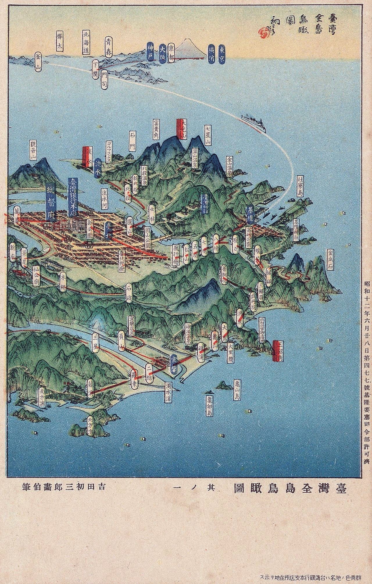 1934年台北市役所為籌備隔年開幕的「台灣博覽會」,邀請他來台灣,於全台各地寫生製作鳥瞰圖,隔年於台灣博覽會上展出〈台灣全島景勝鳥瞰圖〉。