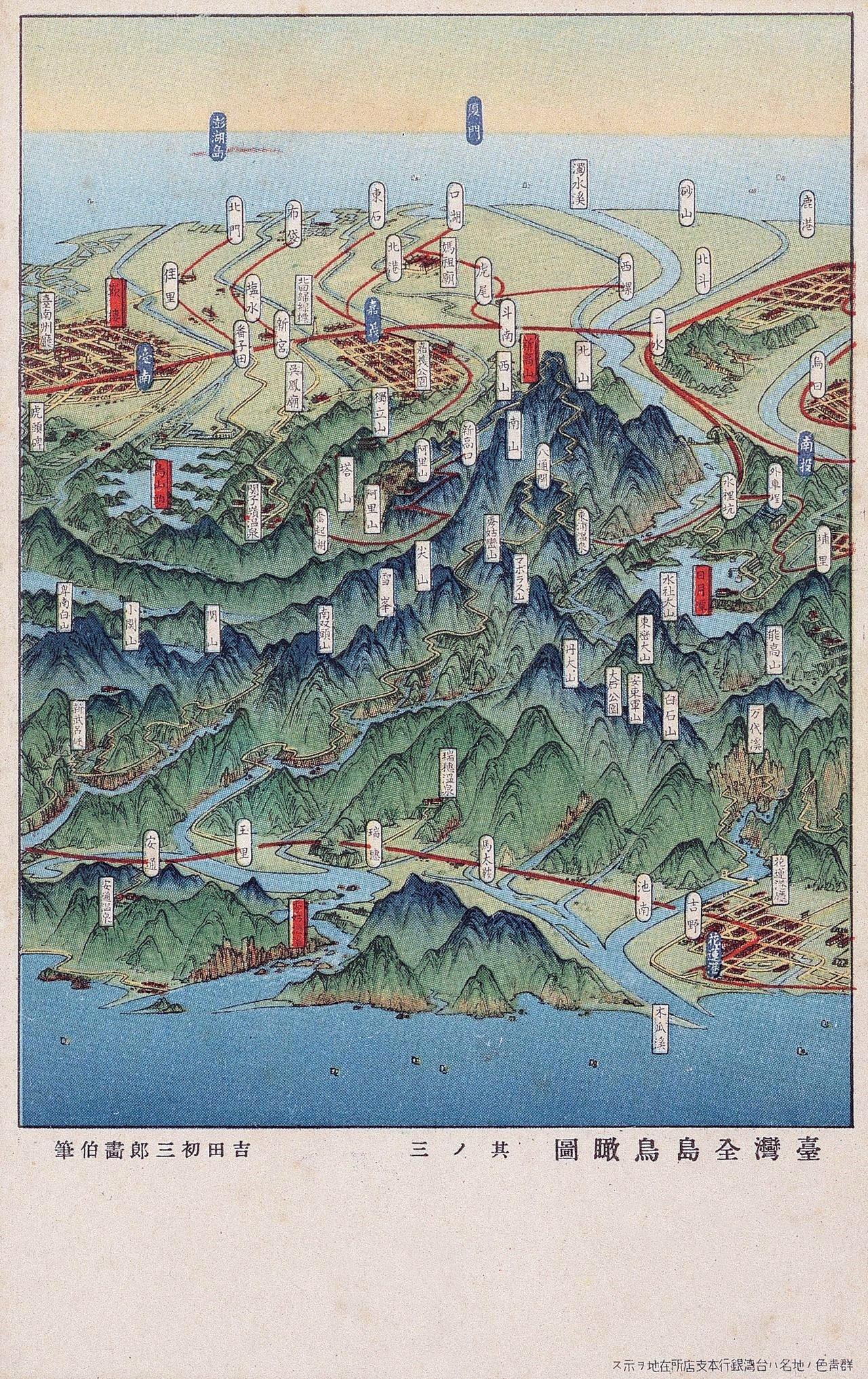 下圖為吉田初三郎作品〈台灣全島景勝鳥瞰圖〉明信片四張內容。(國立台灣歷史博物館)
