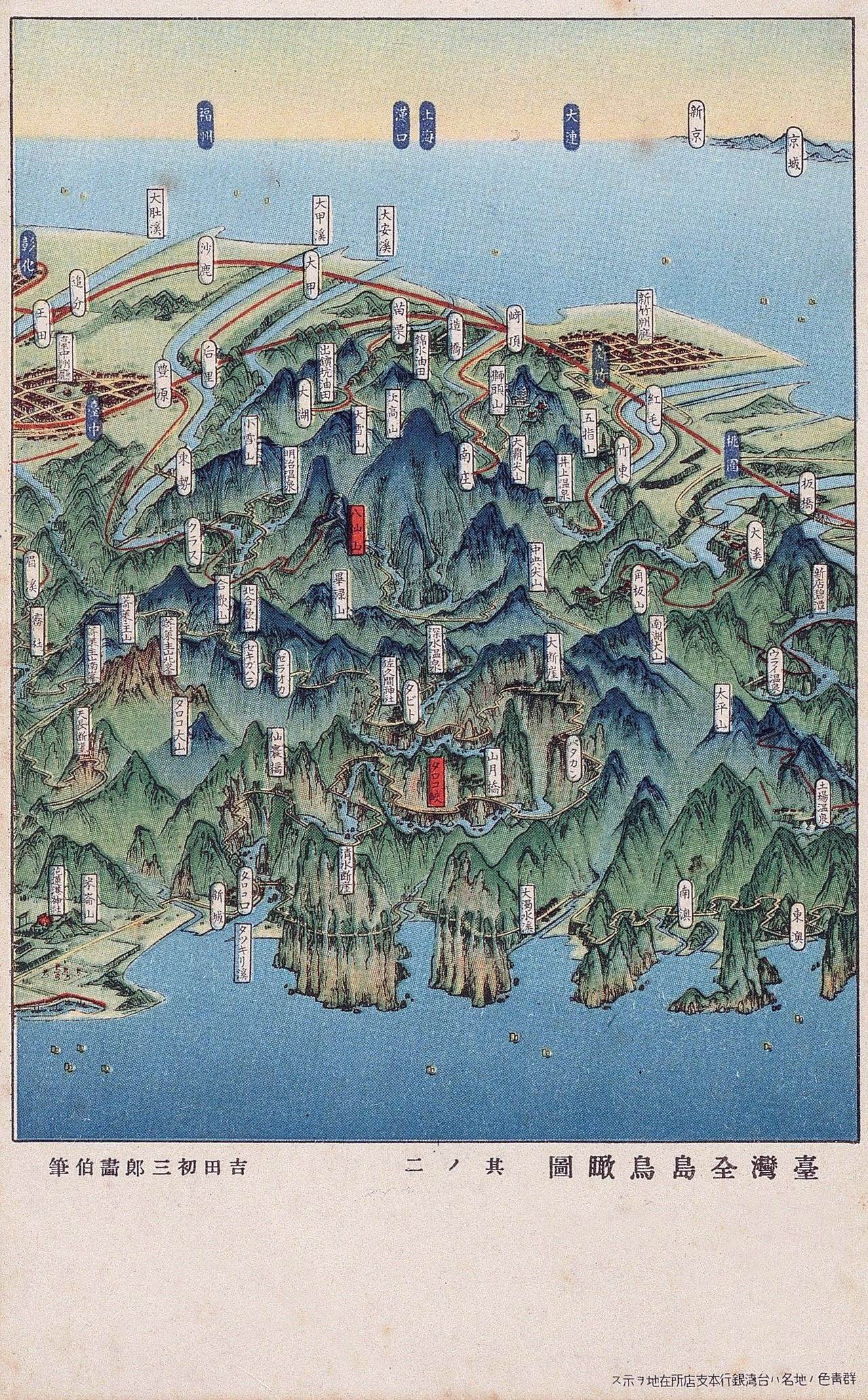 下圖:金子常光繪製的「國立公園侯補地新高阿里山」,當時流行以此種鳥瞰圖作為宣傳或旅遊指引/國立臺灣歷史博物館
