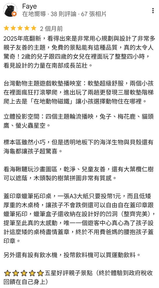 從谷歌地圖的用戶回饋意見可看到遊客對新的遊客中心非常滿意,甚至小朋友可以在裡面「玩了整整四小時」,可見這裡真是讓親子旅遊流連忘返的好地方!
